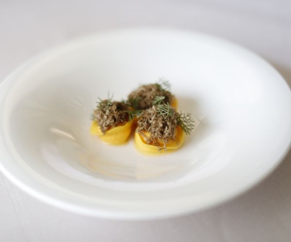Cook the penne mezzani rigate di Gragnano for 10 minutes, drain them and sauté them with the saffron reduction.