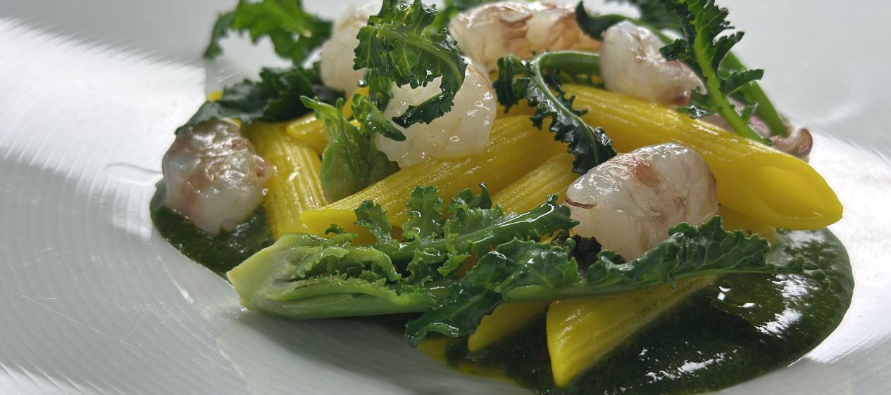 Penne Mezzani Rigate from Gragnano with Saffron, Prawna and Fiolaro Broccoli from Creazzo