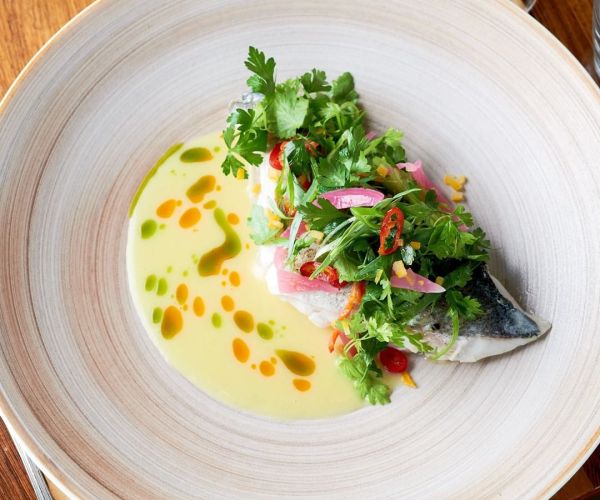 It’s time to serve your dish! Place the salmon and fennel on a plate and cover with a drizzle of the lemon sauce, tarragon oil and harissa cream.