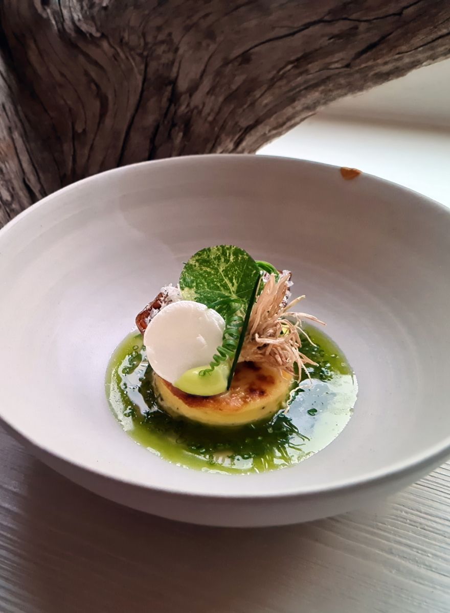 Inspired by the natural flavors of the Canary Islands, this recipe combines the essence of pine and seasonal vegetables in a delicate infusion, accompanied by a smooth pine sauce. The curd, with its velvety texture, and the refreshing pine and lemon gel add depth to the dish, beautifully complemented by the crispy obulato and aromatic dehydrated herbs. This is the dish that Borja prepared during the Bacchus Restaurant of the Year awards in Bulgaria, where he was invited to cook. Borja is excited to share this recipe, allowing you to recreate this exceptional dish at home and experience its refined flavors.