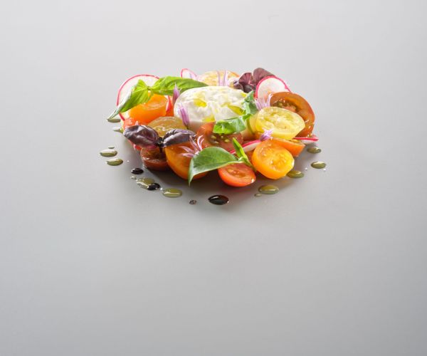 Place the gazpacho in eight chilled plates and season with freshly ground pepper. Add the remaining elements and finish with basil, fleur de sel, coarse pepper and olive oil.