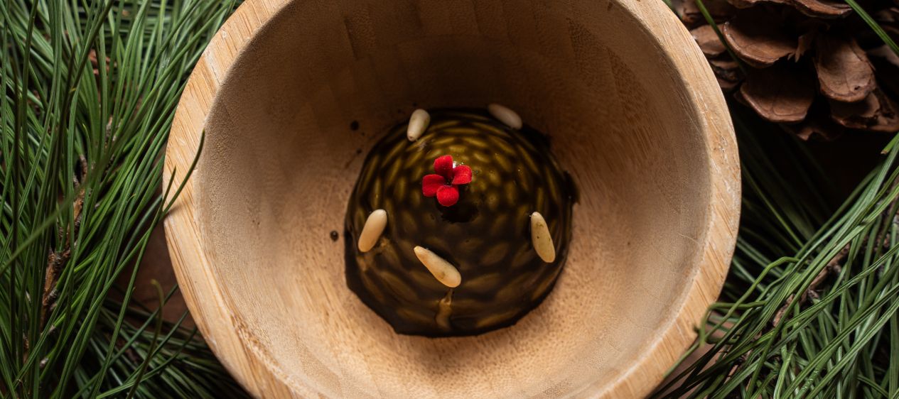 Inspired by the landscape of Valquemado, this dessert is shaped like a pinecone and hides a Parmigiano Reggiano cheesecake at its core. Pine-infused glaze and gel, enriched with broom flower honey, add aromatic intensity and connect the dish to its natural surroundings while showcasing the unexpected potential of the cheese.