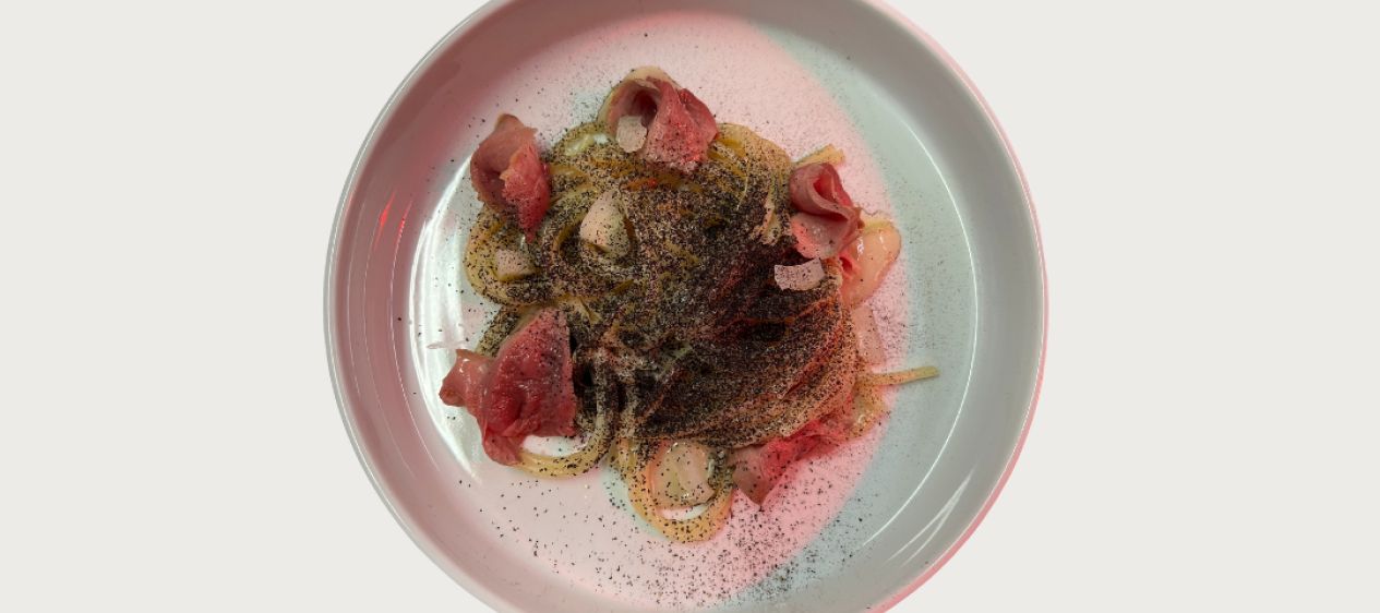 On a plain dish, add the sauce obtained mixing the broth and the fermentation liquid, then lay the vermicelli on top of it. Put the sliced duck breast on the sides and the burnt onion powder on top. Finish the plate by adding the fennel brunoise.