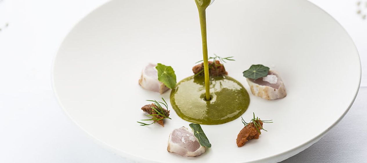 The menu shifts with the seasons, following a rhythm set by game, vegetables, preserves and whatever the team grows nearby. José Antonio Medina reimagines dishes his mother taught him — garlic soups in winter, green beans with partridge, classic pisto — using the same techniques he learned under chefs like Iván Cerdeño. The plating is careful, never theatrical. It’s cooking shaped by the plateau: spare, seasonal, slow. Some dishes are served just as they always were, others are stripped down to their essence. All of it is personal.