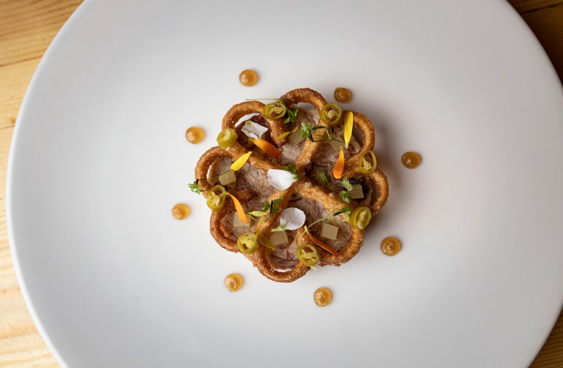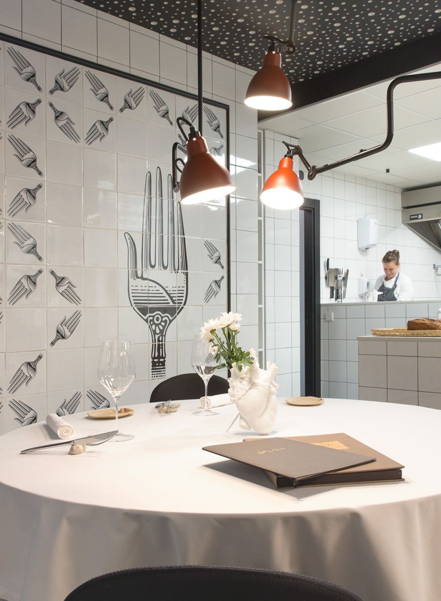 Restaurant Juan Carlos Ferrando, located in the city of Logroño, has a contemporary retro ambiance. You enter through a big steel door and are greeted by a colorful interior with different textures: ceramics, graffiti, posters, and lamps. The La Rioja region is famous for its wine, but it is also a region that is passionate about haute cuisine. As the nation's capital, Logroño meets all criteria necessary to be a welcoming city for tourists. The restaurant is located in one of the most popular tapas areas in the last few years amongst the locals and is known for its high-quality food.
