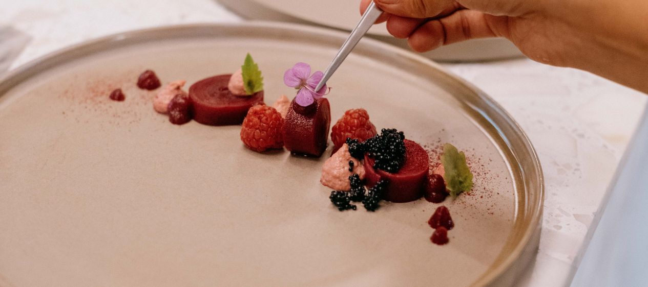 Beetroot Variations with Matured Caviar, Wasabi Leaves, and Smoked Fish by Chef Alexandre Ciriello from L'Horizon.