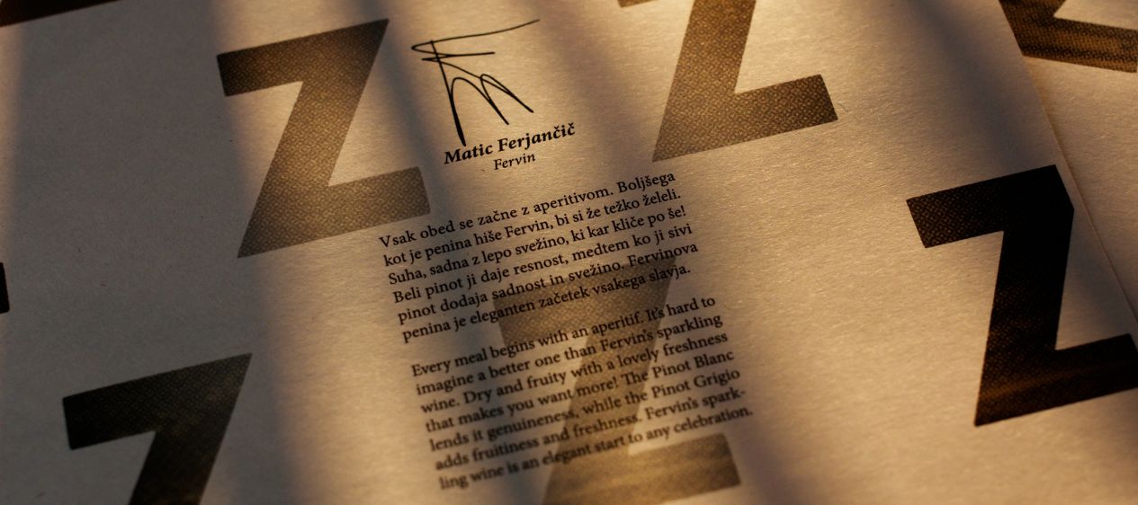 Vsak obed se začne z aperitivom. Boljšega kot je penina hiše Fervin, bi si že težko želeli. Suha, sadna z lepo svežino, ki kar kliče po še! Beli pinot ji daje resnost, medtem ko ji sivi pinot dodaja sadnost in svežino. Fervinova penina je eleganten začetek vsakega slavja.