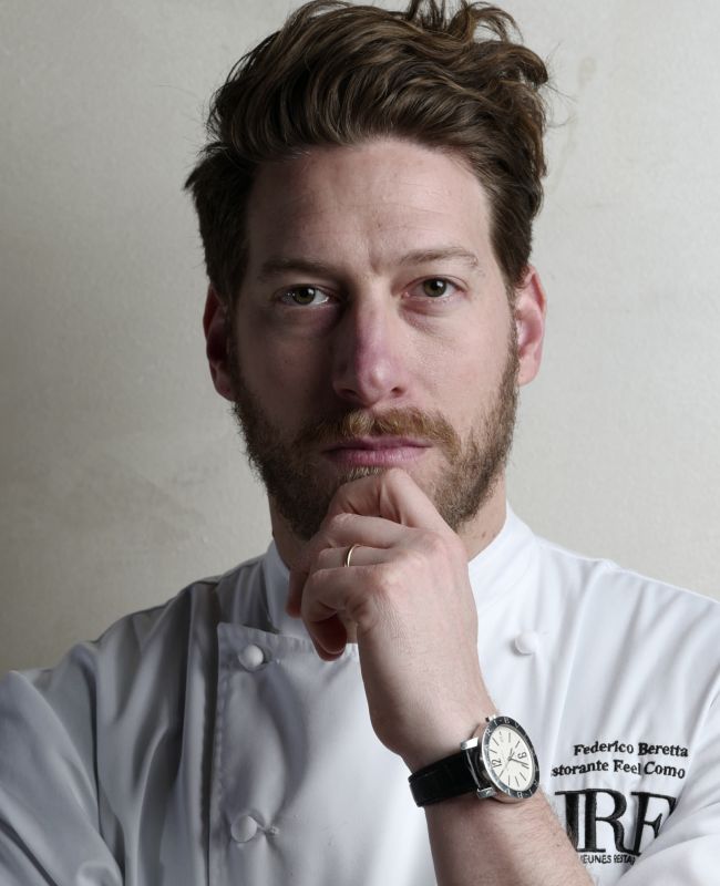 El chef Federico Beretta nació en Milán en 1983. Es el chef patrón del restaurante Feel de Como. A través de sus platos, utiliza su energía e intuición para contar su historia culinaria de las estaciones, el territorio y las materias primas. Estudió para ser técnico de servicios de restauración en el Instituto Hotelero Amerigo Vespucci de Milán. En 2014, tras 11 años de trabajo en las cocinas de Lombardía y de otros lugares del extranjero, el chef Federico abrió el restaurante Feel junto con su esposa Elisa. Los platos que prepara Federico representan una visión de los valles, prados, bosques y lagos de la región en la que vive. Esta cocina local es conocida por sus distintos sabores, texturas y experiencias, que reflejan la naturaleza de este hermoso rincón del lago de Como.