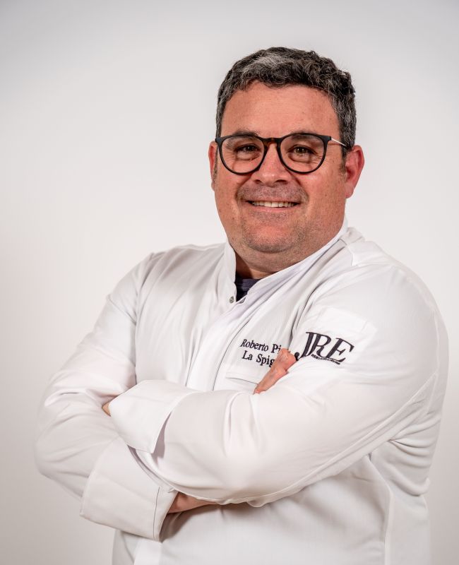 El chef JRE Roberto Pisano dirige La Spigola en Golfo Aranci con una trayectoria marcada por la disciplina y la atención al detalle: fue oficial de la Marina y ha trabajado en cocinas con estrella Michelin. Su cocina se basa en la estacionalidad, las cadenas de suministro cortas y el respeto por los ecosistemas marinos. Pisano selecciona personalmente el pescado y aplica técnicas como la maduración en seco, mientras que un enfoque sin desperdicio guía el uso integral del producto, incluidas especies locales menos conocidas. Colabora estrechamente con productores y utiliza el menú para comunicar con claridad la importancia de la biodiversidad y el estado del mar.