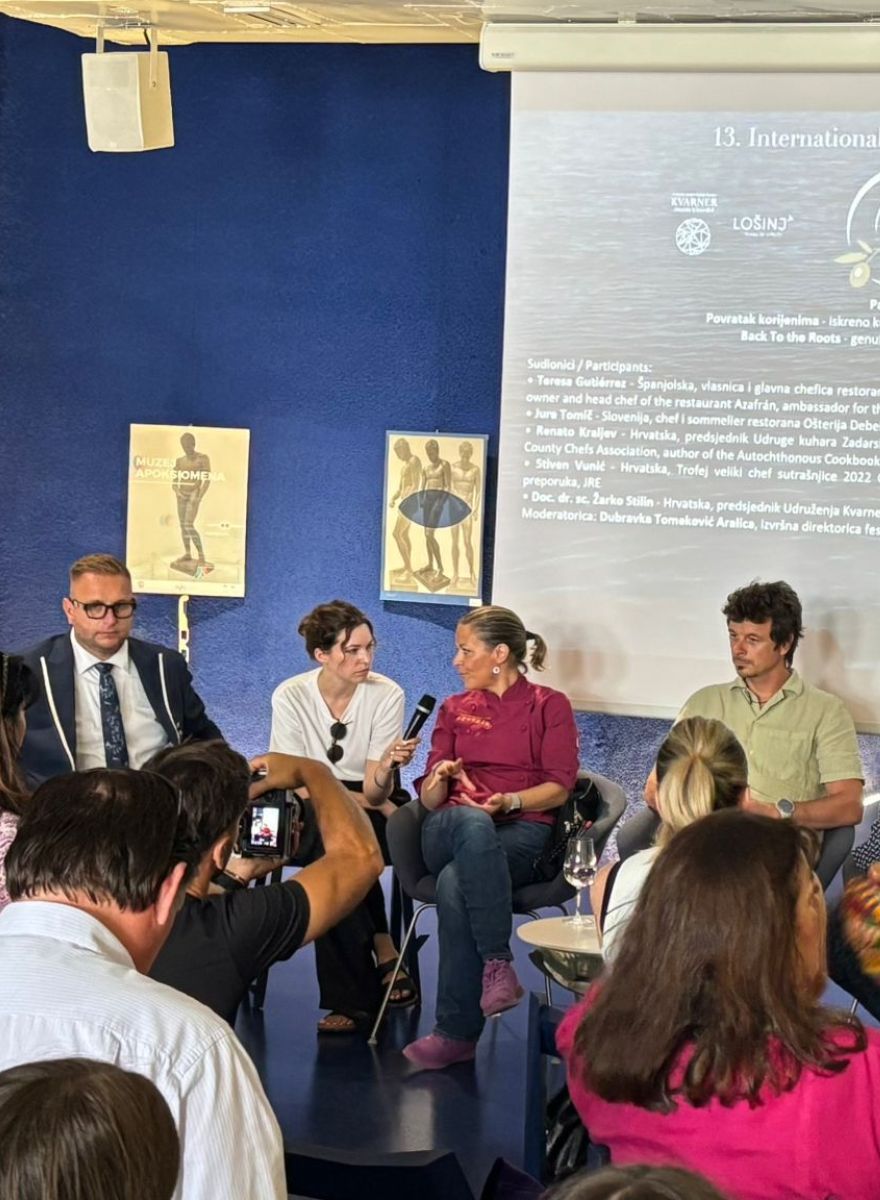 El tercer hito fue su intervención en la conferencia “Kvarner – European Region of Gastronomy 2026”, dentro del panel “Back To the Roots”, centrado en la cocina auténtica basada en ingredientes regionales y de temporada. Teresa compartió espacio con destacados chefs y expertos como Jure Tomič (Eslovenia, JRE), Renato Kraljev (Croacia), Stiven Vunić (Croacia, JRE) y Žarko Stilin (presidente de la Asociación de Vinos de Kvarner). Allí defendió la necesidad de rescatar las tradiciones y reinterpretarlas con creatividad para mantener viva la identidad cultural en la alta cocina.