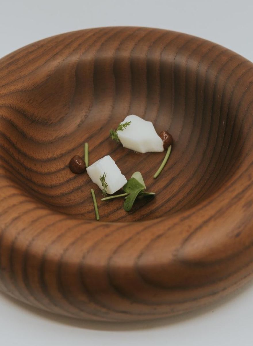 Cortar las hojas y las cáscaras del colinabo y cortarlo en rodajas muy finas. Encurtir el colinabo en un poco de sal de roca con una gota de vino blanco durante 4 minutos. A continuación, guarde el colinabo en agua helada para que quede crujiente. Cuando esté listo para servir el plato, condimente el colinabo con un poco de sal de roca y semillas de comino tostadas.
