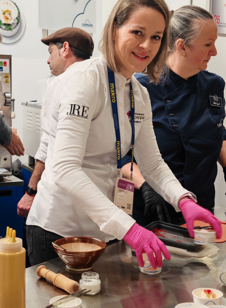 En Madrid Fusión 2026, la chef Teresa Gutiérrez, de Azafrán en Villarrobledo, participó en una iniciativa especial junto a Carpigiani, la firma italiana especializada en tecnología para helado, explorando el papel del helado en la alta cocina contemporánea.