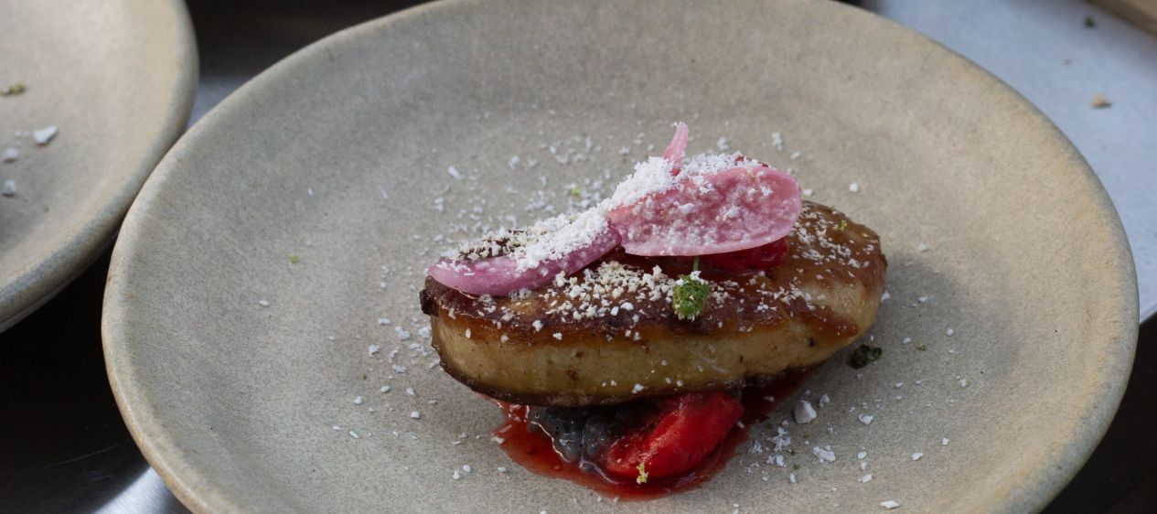 Entrée chaude Escalope de foie gras poêlée Maison Rougié, gingembre fraise, Porto et estragon du Mexique