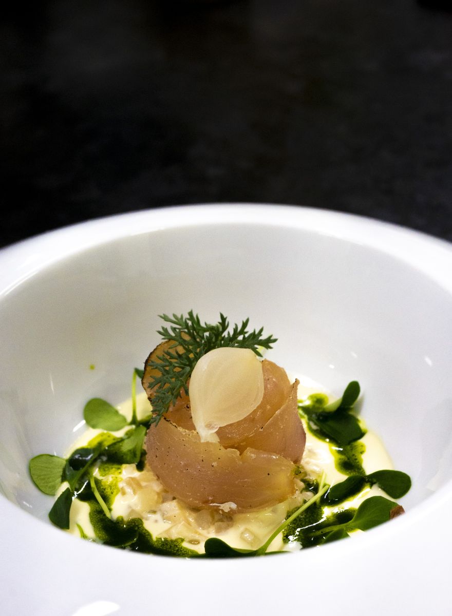 Sandre fumé, céleri, cornichons, pickles d'oignons grelots, crème de fanes de carottes, tahoon cress, et achillée millefeuille
