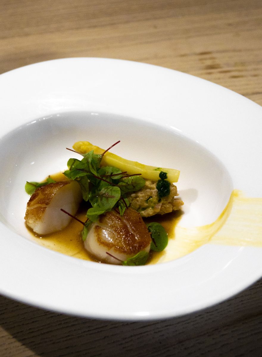 Saint-Jacques snackée, risotto aux algues, asperges blanches, jus à la volaille de Bresse, ail des ours et huile d'olive 2è récolte Parcelle 26, poudre d'algues gold et poudre de chocolat de Colombie