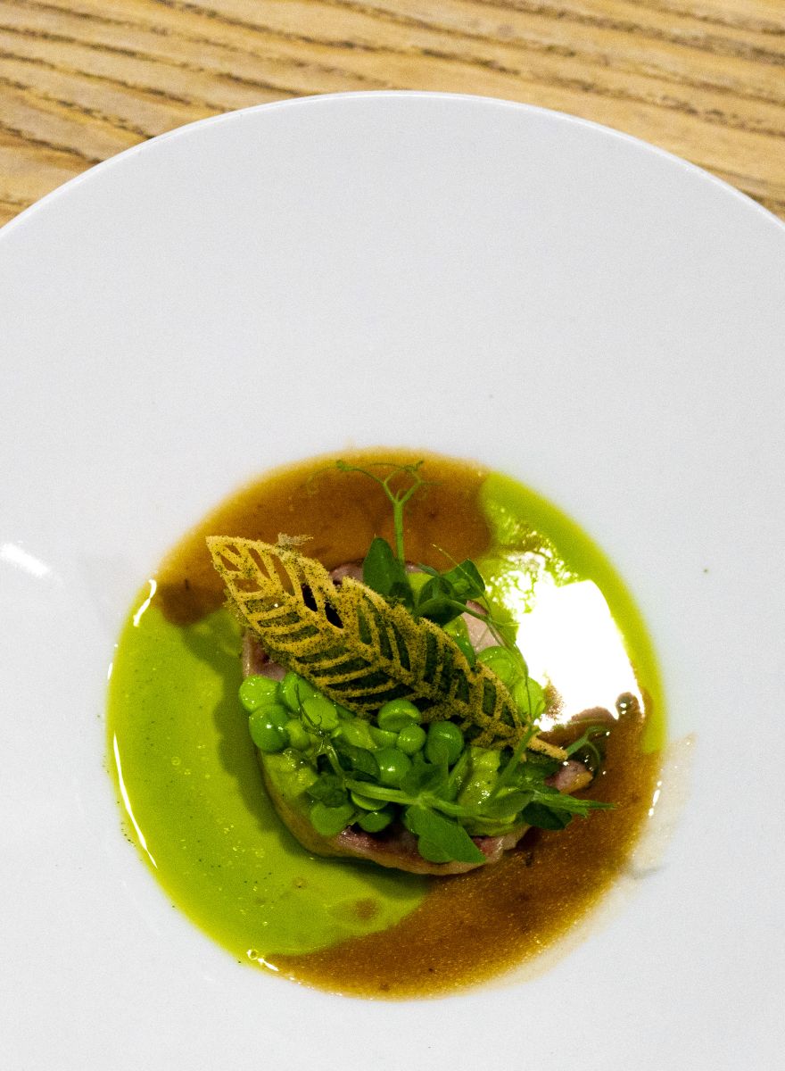 Volaille et foie de volaille , petit pois frais et crème, cresson, afilla cress, jus de volaille et cresson