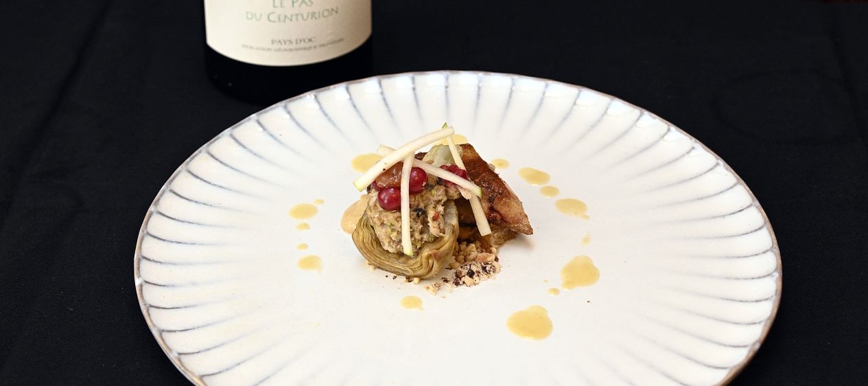 Artichaut farci au maquereau fumé, girolles et groseilles,