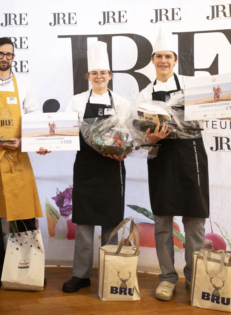 Au terme d'une compétition intense, Leonie De Vlieger et Nick Borremans, représentant fièrement l'école hôtelière Ter Groene Poorte de Bruges, ont brillamment remporté le premier prix, démontrant ainsi leur maîtrise exceptionnelle des arts culinaires. Dans la lignée des éditions précédentes, des distinctions spéciales ont été attribuées pour la meilleure entrée, remportée par Ter Groene Poorte de Bruges, le meilleur plat, remportée par l’école Hôtelière de Turnhout, et la meilleure Mystery Box, remportée par Ter Groene Poorte.
