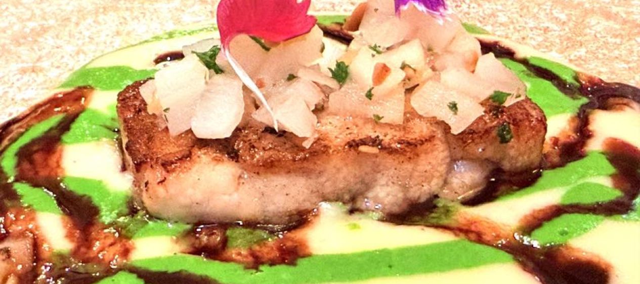 Pressé de Ris de Veau condimenté ensuite, avec crème de Salsifis, jus de Pourpier, réduction de viande et Vinaigre au beurre. Le ris de veau était succulent, compressé en un joli rectangle, les trois sauces fort gourmandes. C’était aussi bien chaud, ce qui était fort plaisant.