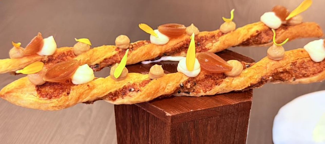 Un petit bol contenant une mousse de Gruyère AOP sur lequel on vient verser un consommé d’oignons froid. Ensuite un Feuilleté torsadé garni de confiture d’oignons, crèmes, oignons confits, pétales etc, à croquer tout du long. Enfin la grande assiette avec un croûton de pain noir, quelques points de crèmes et confiture d’oignons et ensuite une vraie soupe à l’oignon chaude qu’on vient verser autour. On commence par le froid afin de laisser le temps à la soupe d’imbiber le croûton de pain dans l’assiette principale.