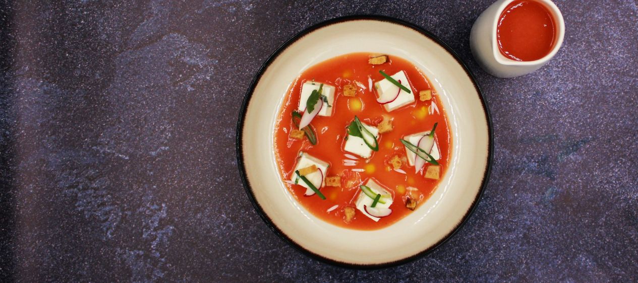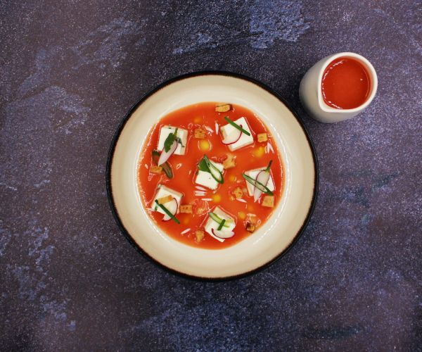 Mixer le gazpacho avant de servir. Dans une assiette creuse, verser un fond de gaspacho. Mettre le reste dans une saucière pour servir à part. Déposer harmonieusement quelques cubes de mousse de chèvre. Décorer votre assiette et servir.