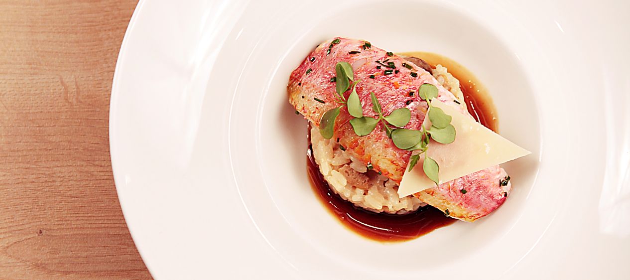 Rouget Barbet, risotto à la moelle de bœuf jus au vin rouge corsé