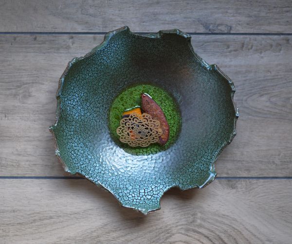 VELOUTÉ DE POTIRON « HUBBARD BABY BLUE » À L’HUILE DE NOISETTES ET PAIN D’ÉPICES, CRÈME MONTÉE À L’AIL NOIR