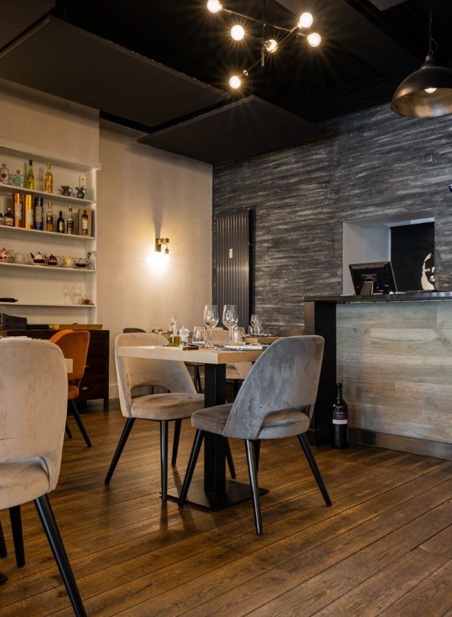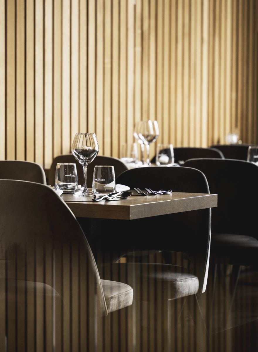 Dès le seuil franchi, le lieu séduit par son harmonie : un cadre net, clair, apaisant, à l’image du village. Comme une photographie grand format où tout serait mieux qu’à sa place. Le bois réchauffe les murs, les lumières glissent doucement des parois, le mobilier contemporain respire la délicatesse — autant d’éléments qui composent un décor soigné, pensé, où l’on se sent bien avant même d’avoir goûté.