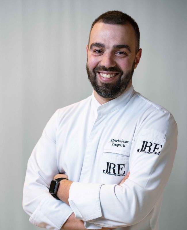 Nato nel 1984, lo chef Alberto Basso ha studiato alla scuola di cucina Portinari, che fa parte del ristorante La Peca, premiato con 2 stelle Michelin. Sono due gli obiettivi che gli stanno a cuore: il piacere dei sensi e la creazione di piatti omogenei con consistenze distinte. Lo chef desidera che ogni commensale possa godere pienamente di ogni ingrediente. Con la sua cucina creativa, lo chef Alberto sfrutta al massimo i prodotti locali, ma non è strettamente ancorato alla sua regione. Alla ricerca delle migliori materie prime, la sua ricerca si estende a tutta l'Italia. Al ristorante TreQuarti, Alberto combina elementi della tradizione con metodi di cottura moderni ed efficaci che gli permettono di ripensare ogni piatto in modo contemporaneo. Il risultato è un piatto in cui gli elementi principali rimangono facilmente riconoscibili, avvolti in un gioco di contrasti e sensazioni squisite.