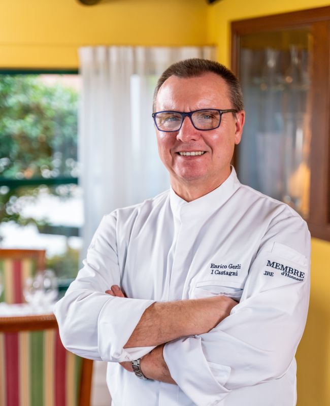 Lo chef Enrico Gerli è alla guida di I Castagni dal 1989, trasformando una fattoria di famiglia nella campagna di Vigevano in una destinazione gastronomica premiata con una stella Michelin. Autodidatta, con un diploma di sommelier e un profondo amore per il mestiere, ha sviluppato il suo stile attraverso l'istinto, la disciplina e le successive esperienze in cucine stellate. La sua cucina è radicata nella Lombardia e guidata dal gusto, dalla precisione e da una chiara preferenza per la qualità rispetto alla complessità. Il pesce riveste un ruolo raffinato nel menu, insieme ai classici piatti locali preparati con sicurezza.