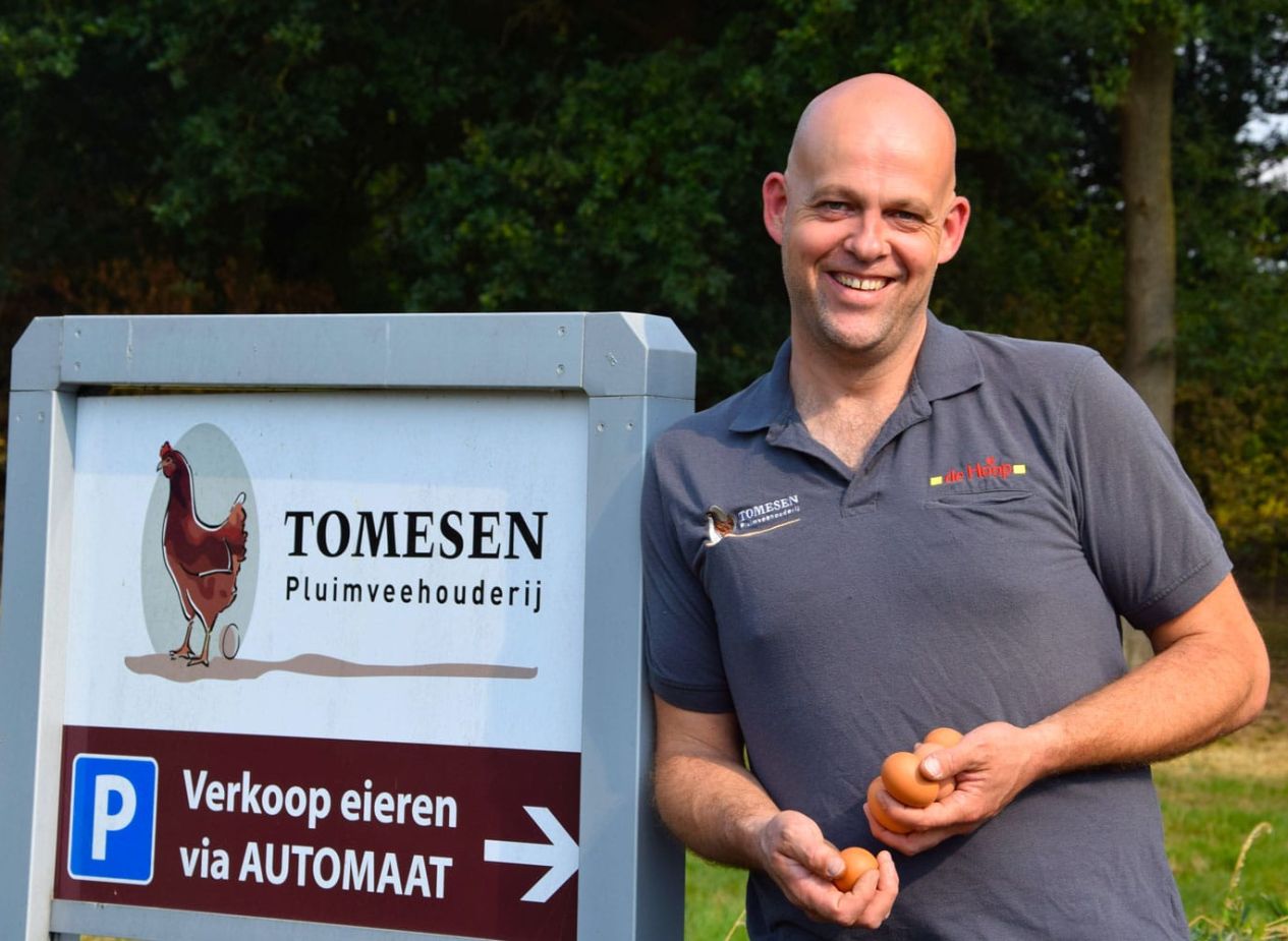 Ben je in de buurt? Fiets dan eens langs pluimveehouder Tomesen aan de Kilderseweg in Doetinchem. Hier haal je de eieren ‘net as vrogger’ uit de eierautomaat! Roy en ik helpen elkaar vernieuwen. Dat het welzijn van zijn dieren voorop staat, is voor mij een extra reden voor een mooie samenwerking.