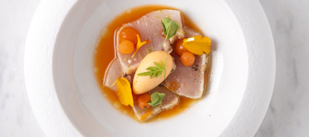 Het voorgerecht bestond uit Hamachi Kingfish, bereid op twee manieren — één koud en één warm — telkens begeleid door maximaal twee identieke garnituren: wortel en één vrij gekozen ingrediënt.