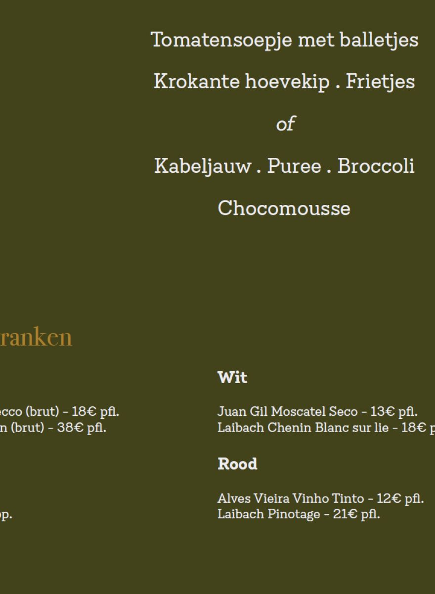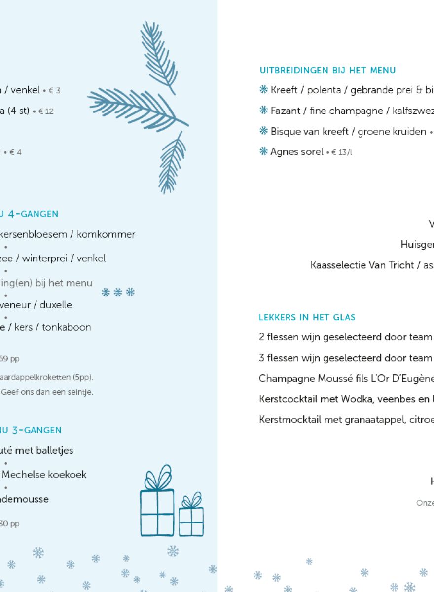 Naar aanleiding van de eindejaarsfeesten, bieden veel van onze leden een Kerst- of Nieuwjaarsmenu voor, mee te nemen of ter plaatse te degusteren. Hieronder een paar voorbeelden: