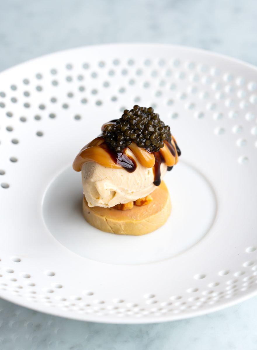De Ölliemölle sloot de lunch af met een gedurfde combinatie van ganzenlever, bananenroomijs, gezouten karamel, balsamico en kaviaar, waarin zoet, hartig en luxe ingrediënten samenkwamen. Een gerecht dat het signatuur van JRE-chef Roel Sieverink perfect weerspiegelt.