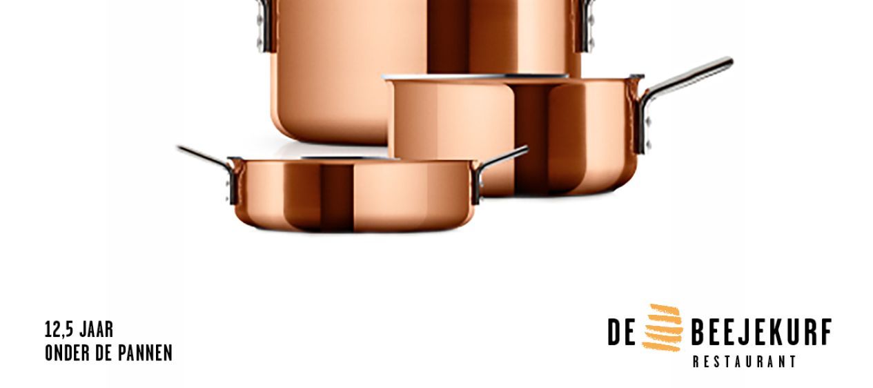 vanaf nu tot 5 juni serveren we ons "onder de pannenmenu" een heerlijk 6-gangen menu (63 euro), en omdat we iets te vieren hebben doen we onze Beejekurf cocktail cadeau als aperitief!. Enkel op reservering ovv jubileummenu.