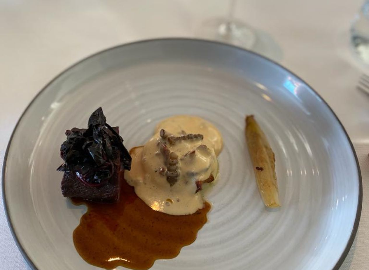 Daarna kwamen we met de chef duidelijk in het herfstseizoen. Als tussengerecht kregen we een lekkere gestoofde kalfswang met morieltjes. Die vinden we altijd super lekker en zijn zo passend bij het herfstseizoen. Hier mocht een steviger bier tegenover staan en dus koos de sommelier voor een telg uit de Amerikaanse microbrewery Goose Island (Chicago): de Goose Island Obadiah Poundage. Deze kruidigheid van het bier ging perfect met de kalfwangetjes samen!