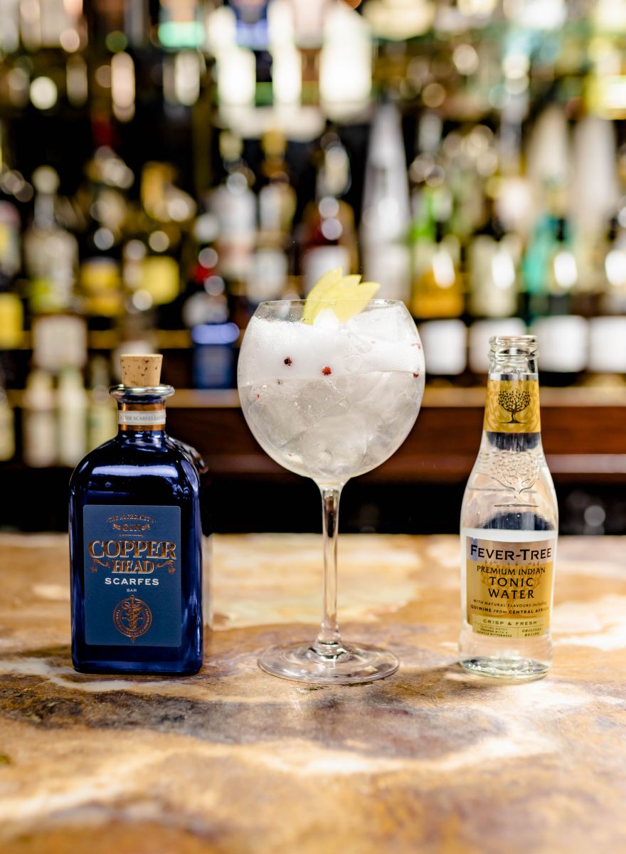 Mix de Copperhead Scarfles Bar metr de tonic en garneer met een zeste van citroen.