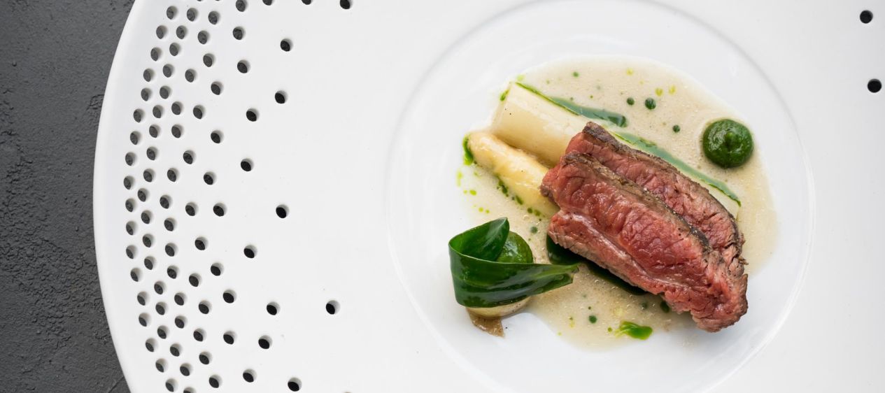 • Serveer de Flank Steak met de gekonfijte asperge, aardappel, lamsoortjes en saus van karnemelk