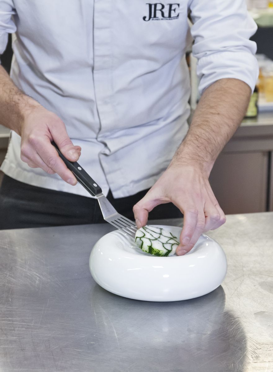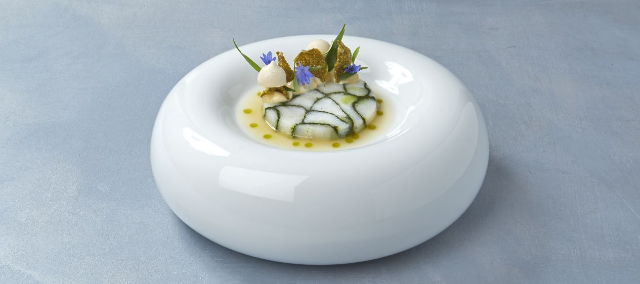 Garneer met de gel van dashi, miso crème, rettich in zoetzuur, dashi meringue en top het af met wat zeeplantjes.