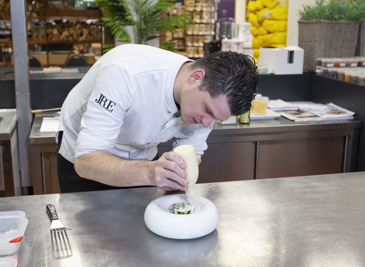 De dashi maak ik zelf met daarin een beetje gerookte paling voor een intensere smaak. De dashi verwerk ik voor dit gerecht in een gel, in een bouillon die ik heel lichtjes afbind met xantana én ik maak een meringue van dashi met poedersuiker, sojasaus en eiwitpoeder.