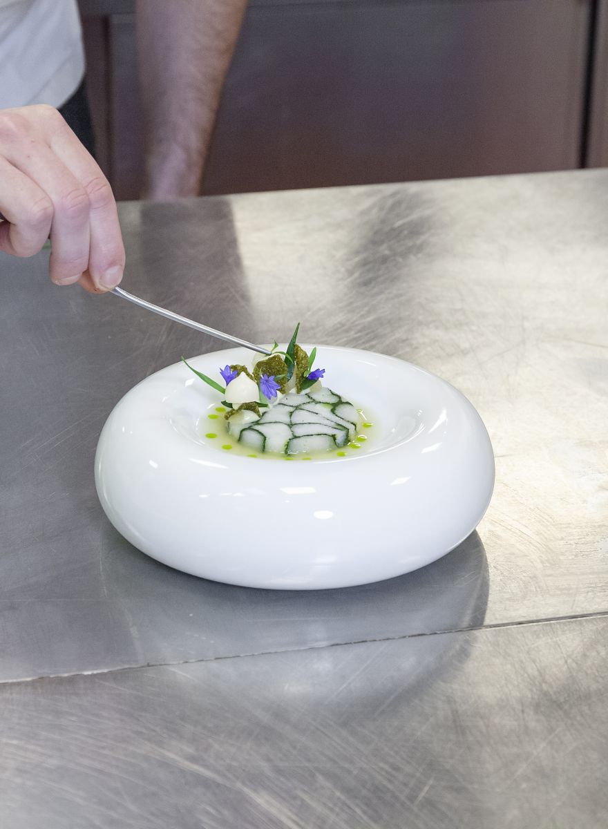 Als finishing touch top ik het gerecht af met een beetje zeepostelein, korenbloempjes, ghoa cress en een klein beetje olie van bosui.