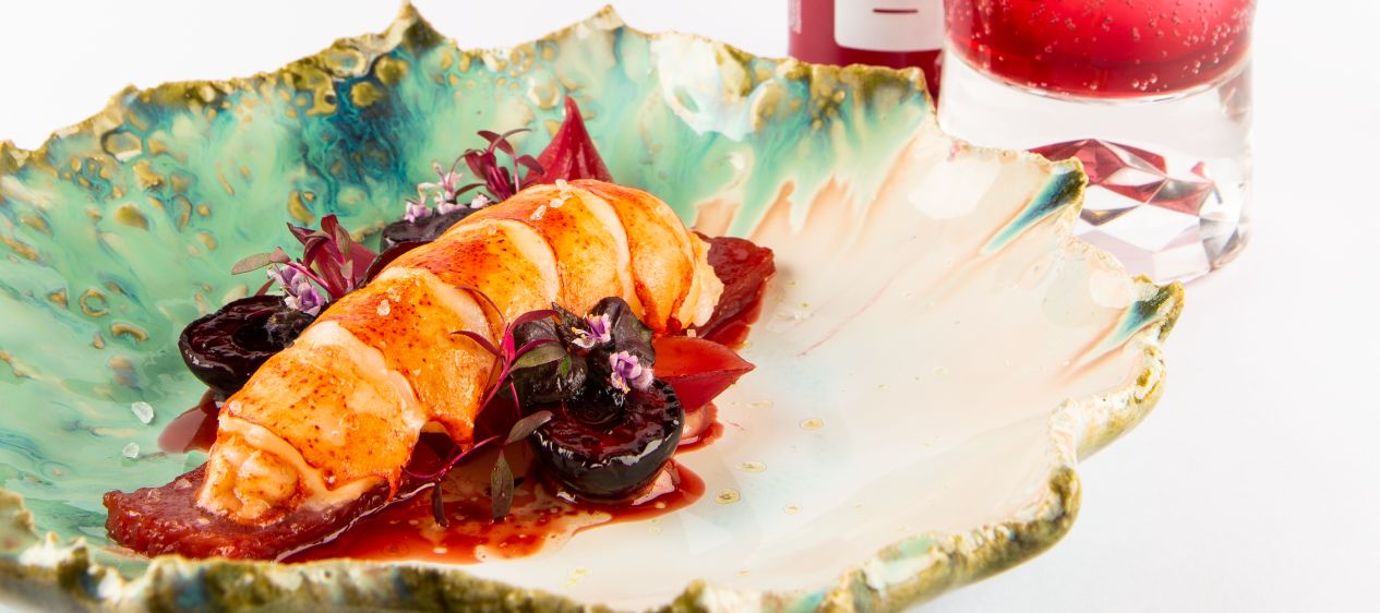 Kreeft met kers, rode ui, Shiso Purple, Zallotti Blossom