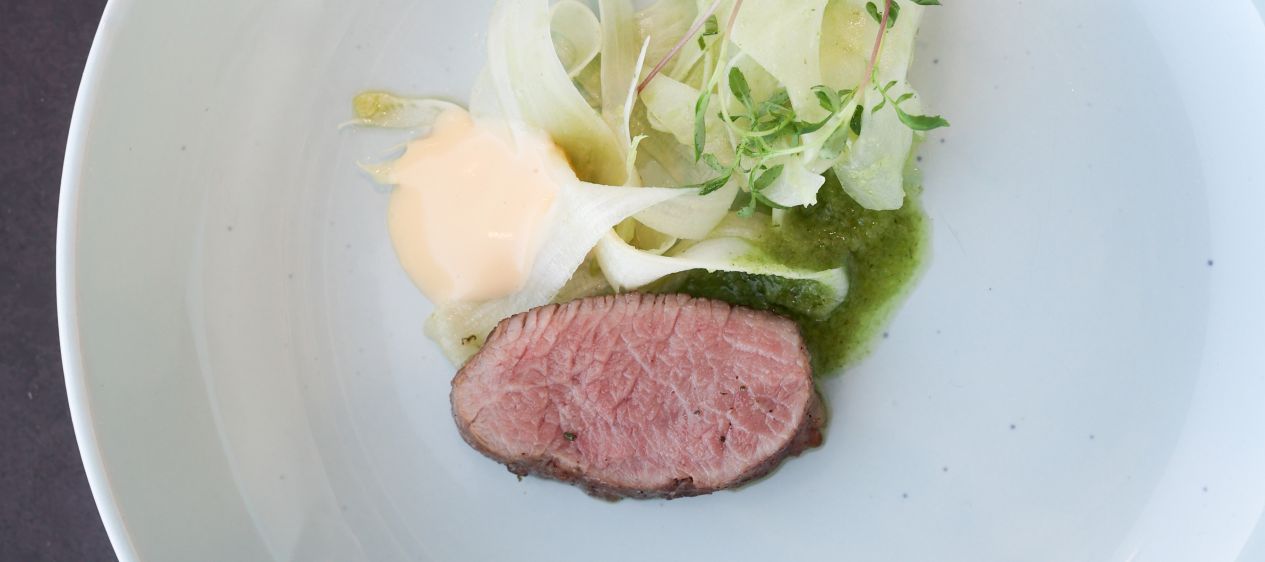 Lamsrug met salade van venkel en asperge, Hollandaise en dressing van dragon.