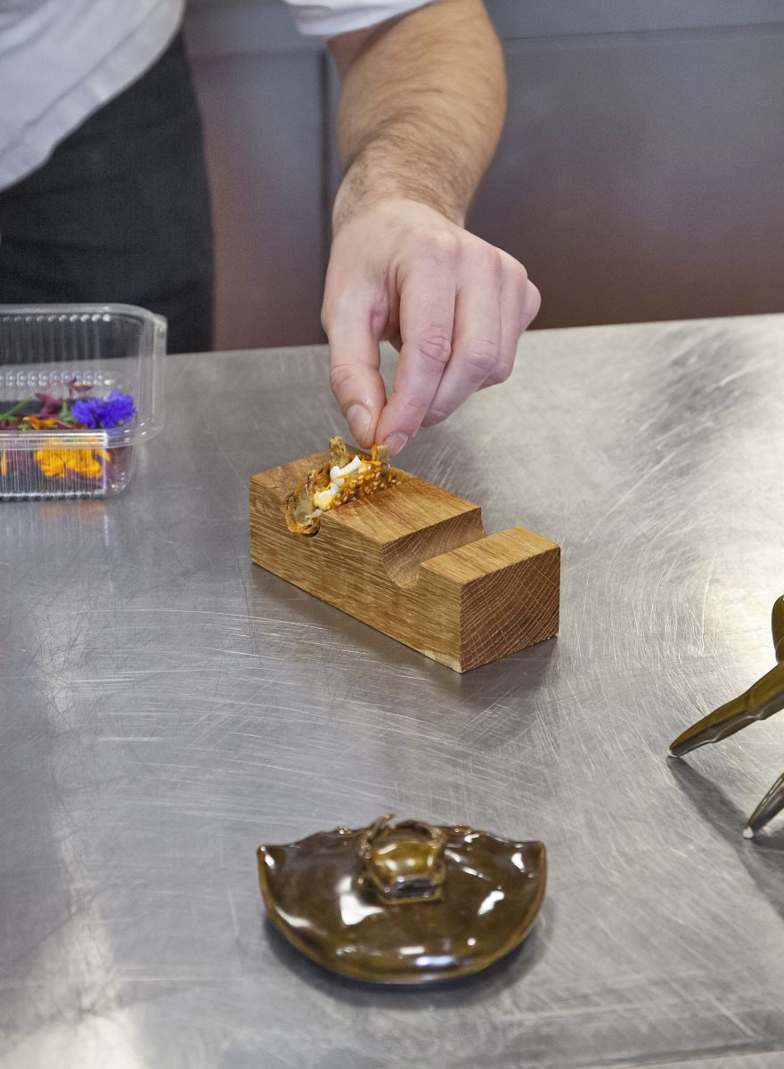 De koppen van de garnaaltjes haal ik door rijstmeel en frituur ik. Die gaan ook in de taco. Ik garneer het geheel met de paddenstoeltjes die zijn ingelegd in zoetzuur en maak het af met goudsbloem.