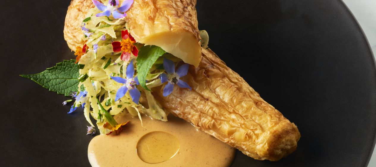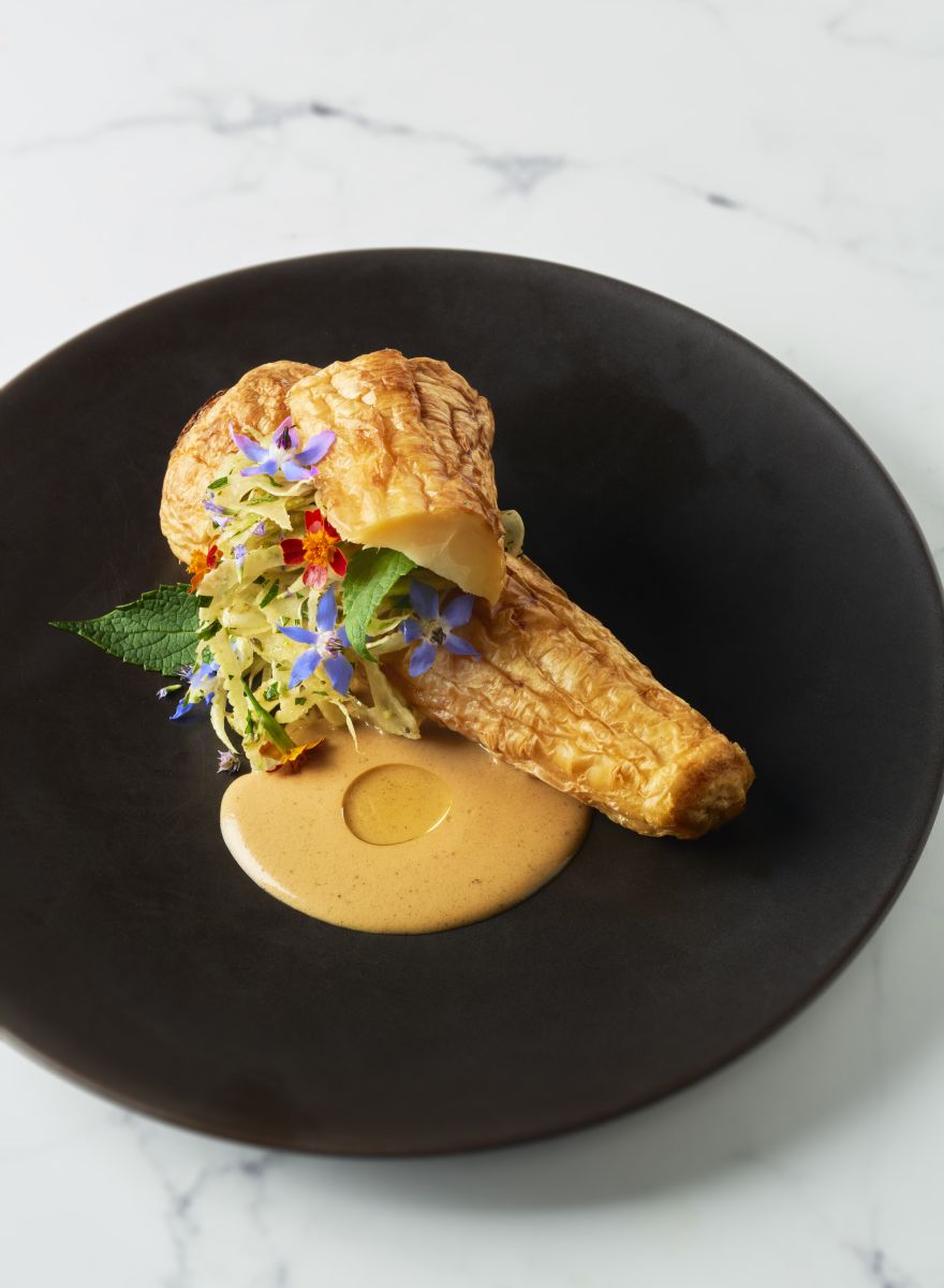 Gaar de pastinaak sous-vide met de room 3 uur op 90˚ C. Rooster 30 minuten op 170˚ C en droog 10 uur lang op 55˚ C. Halveer halverwege om een plateau te krijgen.