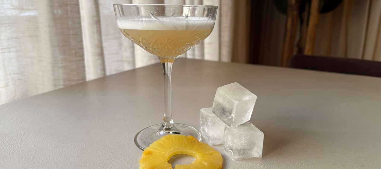 Een zoete mocktail met smaken van kokos, ananas en karamel, met een kleine bloemige hint vanuit de Abstinence Cape Fynbos (0% gin).