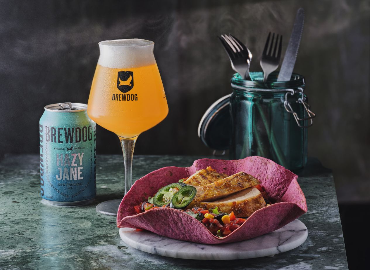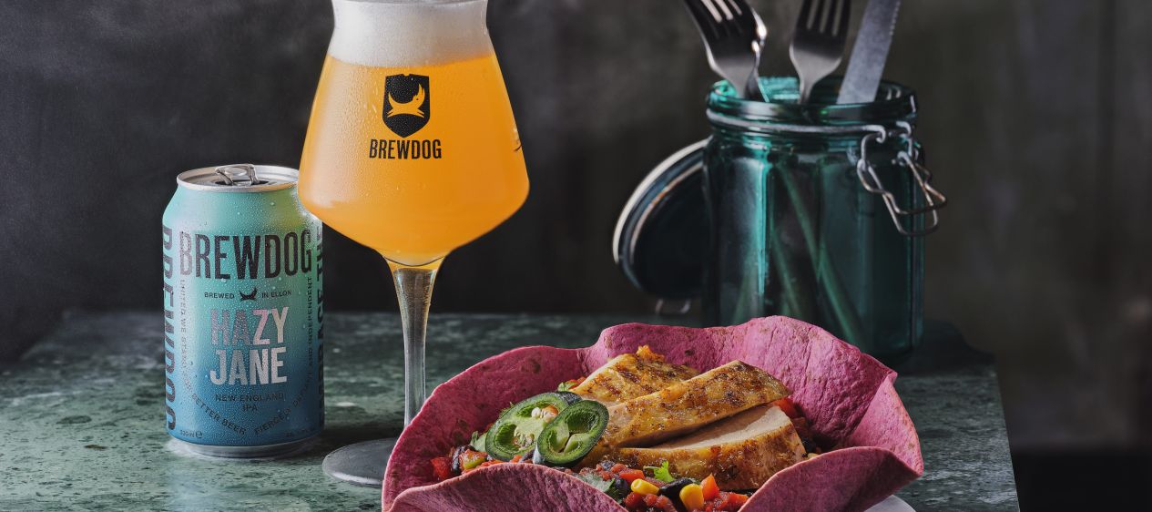 Tortillabakje met chili en krokant geroosterde kip bij Brewdog Hazy Jane NEIPA