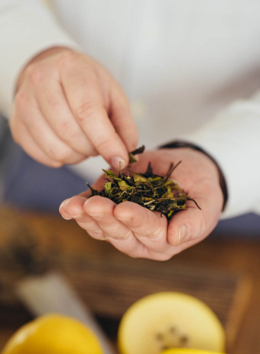 De traditionele witte thee Pai Mu Tan betovert met het open grote bladkarakter. Het idee om deze thee te blenden met kweepeer sap is ontstaan vanuit een meerjarige samenwerking tussen de Privatkelterei Van Nahmen en thee-sommelier Niklas Schmeink. Niklas is sinds 2018 een van wereldwijde theesommeliers op het TeaMaster Gold niveau en adviseert hotels van het hoogste niveau bij het maken van hun theeselectie. Voor Niklas Schmeink is witte thee de ‘koningin onder de theearoma’s’, en voor Peter van Nahmen, eigenaar van Privatkelterei Van Nahmen, is kweepeer sap de ‘koningin onder de vruchtaroma’s’.