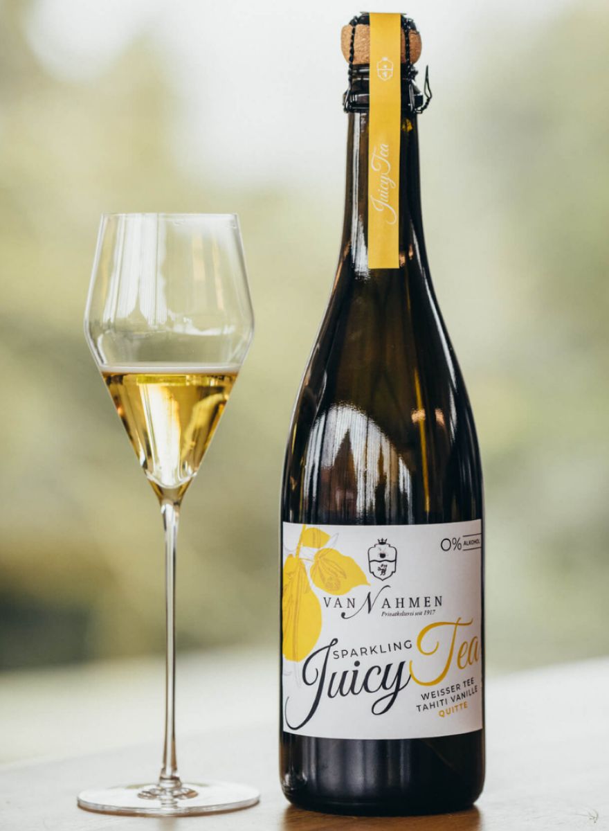 Van Nahmen heeft een nieuwe smaakvariant ontwikkeld in hun succesvolle productserie Sparkling Juicy Tea: Witte Thee – Tahiti Vanille – Kweepeer (Organic).