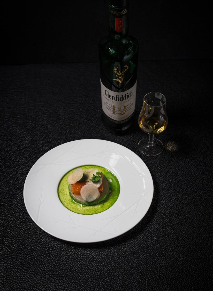 Beide diners begonnen met een zalige highbal, op basis van milky oolong. In deze cocktail zat natuurlijk Glenfiddich en de gasten wisten dit zeker te waarderen. De beginnende whiskydrinker kon alvast aan de smaak wennen terwijl de gevorderde liefhebber verbaasd werd door de andere presentatie van de whisky.